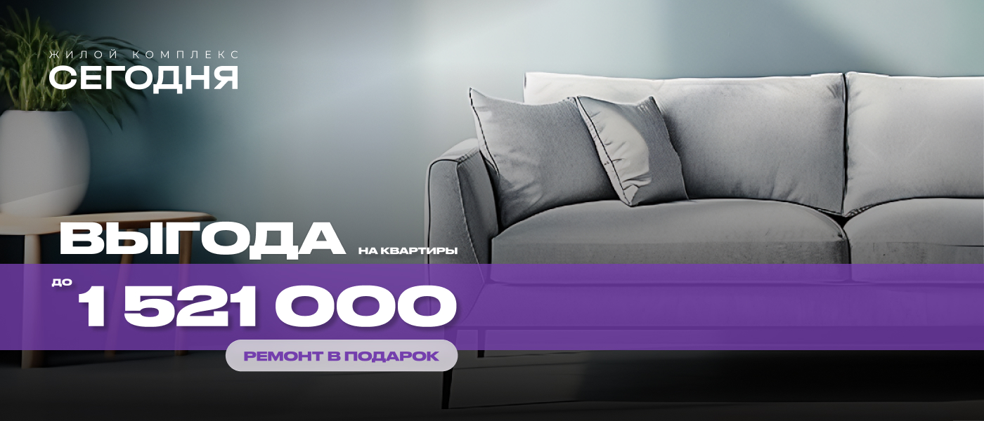 В жилом комплексе «Сегодня» действует предложение: при покупке квартиры вы получаете выгоду до 1 521 000 рублей и ремонт в подарок!
