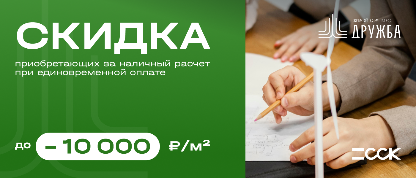 Для тех, кто ищет идеальное сочетание комфорта и выгоды, мы подготовили специальные условия покупки в ЖК «Дружба». При единовременной оплате вы получаете повышенную скидку: 8 000 ₽/м² на просторные двушки, 10 000 ₽/м² на уютные трешки и 20 000 ₽/м² на коммерческие помещения.