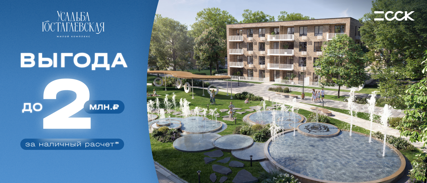 При покупке квартиры в жилом комплексе «Усадьбе Гостагаевской» за наличный расчёт вы получаете до 2 миллионов рублей выгоды.