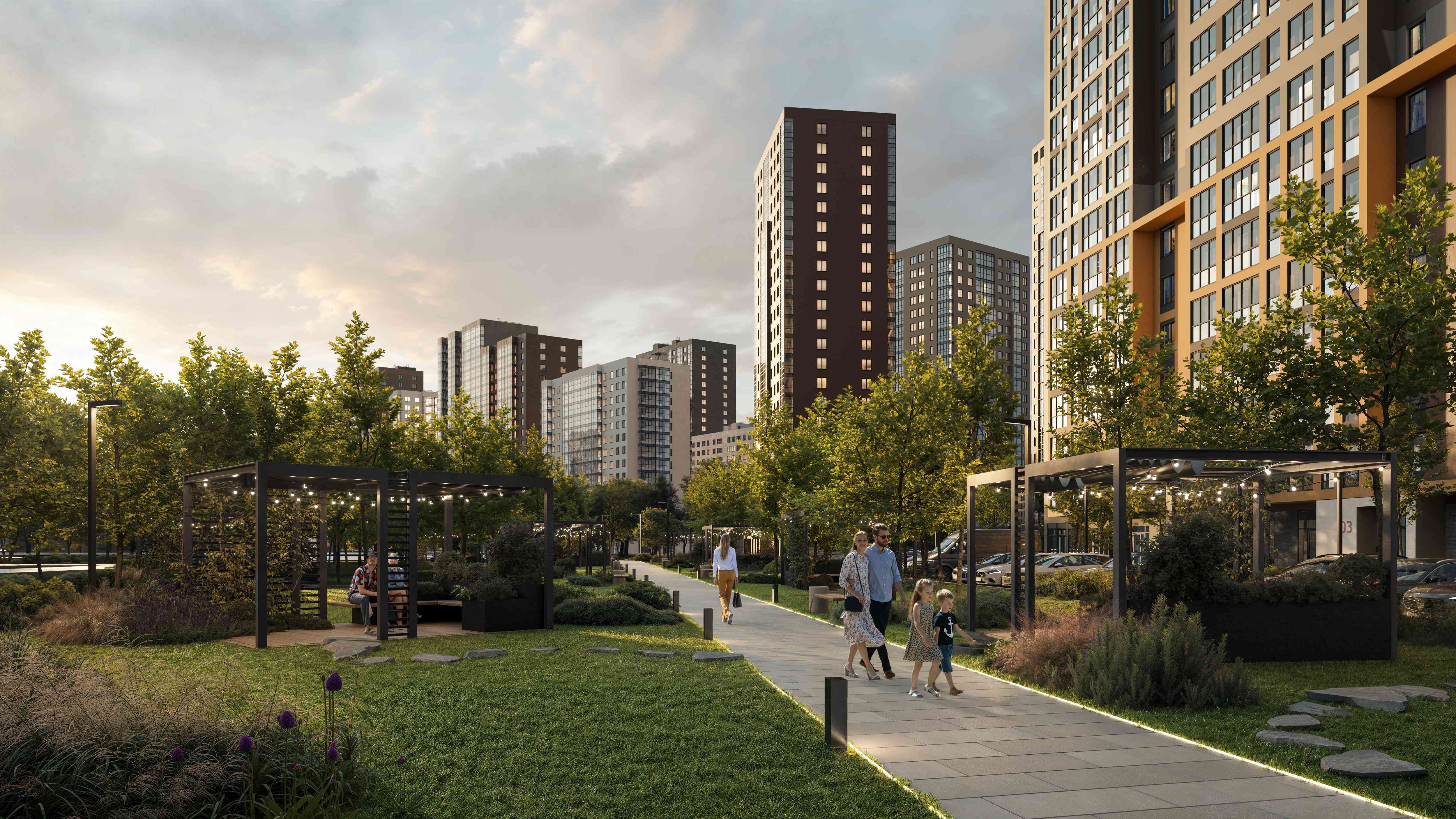 ЖК «Имена» — это 60 гектаров территории с 17 корпусами переменной этажности (от 9 до 23 этажей). В составе комплекса предусмотрены: